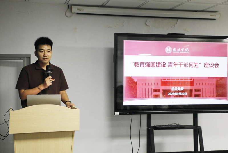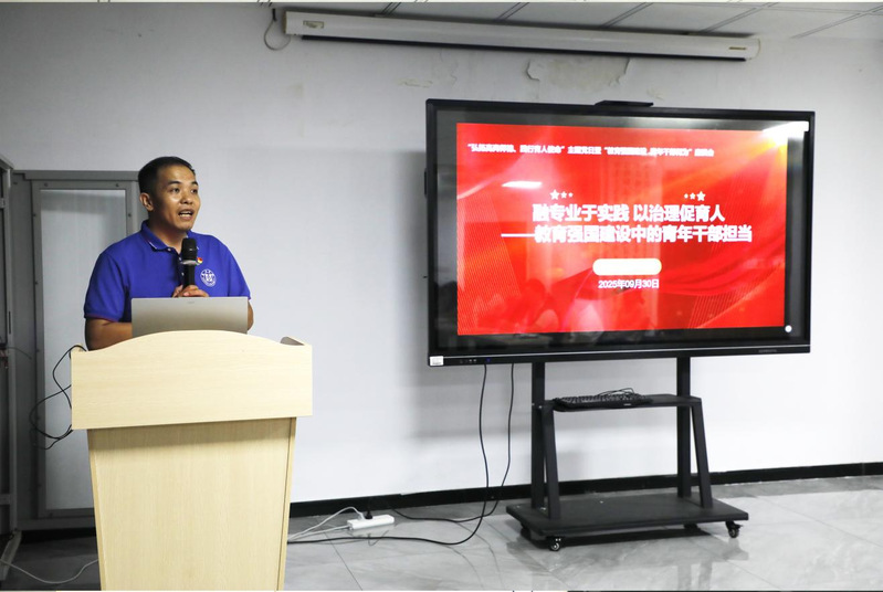 讲座后,会议进入交流座谈环节:党员干部代表陈智慧、杜建聪、马就武围绕“教育强国建设 青年干部何为”主题,结合本职工作进行交流分享。陈智慧家庭荣获全国文明家庭,他以家庭视角切入,分享了家风传承与教育强国建设的紧密联系,强调以党员家庭的日常实践传递敬业与担当精神;杜建聪同志立足共青团工作实际,结合青年思想引领重点任务,分享了今年暑期带领校青马班学员赴井冈山开展实践研学的创新探索,他以井冈山开展实践研学为素材制作的“微团课”视频成功入选广东省委宣传部主办的“粤讲越精彩”栏目,并荣获2025年“立志·修身·博学·报国”主题教育系列活动一等奖。马就武结合社区辅导员和社会工作专业背景,分享了一站式学生社区建设中党建引领、网格治理与矛盾调解相结合的基层治理创新路径。