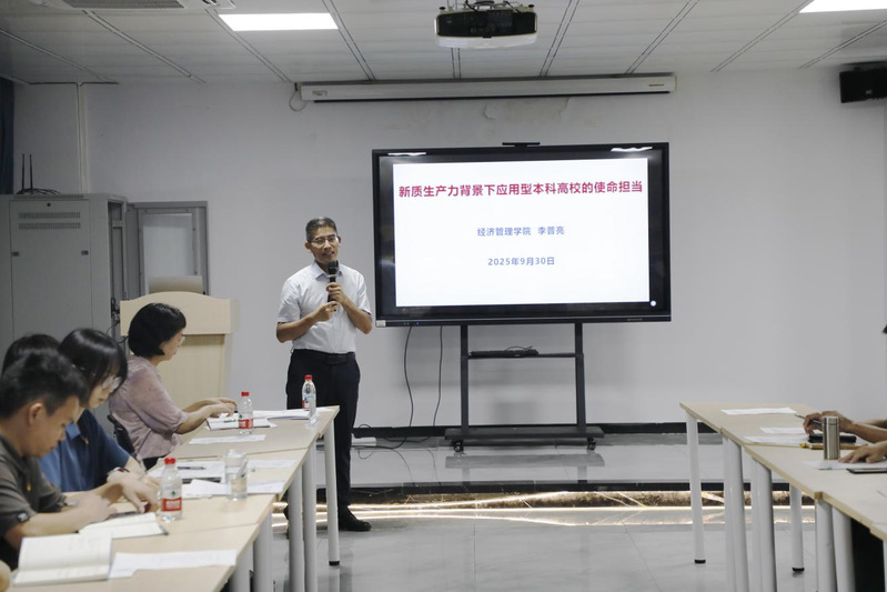活动分三个阶段进行:第一阶段是运用“思享学堂”平台,开展师德师风专题教育,机关党委书记邓淑容带领大家集中学习习近平总书记给全国特岗教师代表的重要回信精神,传达学习学校2025年师德建设主题教育月活动方案有关精神;接着,经济管理学院院长、党委副书记李普亮作《新质生产力背景下应用型本科高校的使命担当》辅导报告,围绕新质生产力的内涵特征、发展新质生产力解读及分析应用型高校在人才培养、科学研究等方面对接新质生产力发展需求,着重强调师德建设的重要性,引导大家深入学习新时代高校教师职业行为十项准则,始终坚持把涵养师德作为立身之本,继续坚守教育初心,不断提高教书育人本领,自觉塑造新时代人民教师的高尚品格。